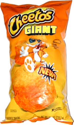 lw April 7th, 2009 My dad got me some of these for a sneak peek, and they aren’t that much cheesier. They’re just larger, so there’s more cheese covering the puff. They’re a fun, new experience, but I’ll stick to the Puffs. Trying to fit an entire Giant into my mouth is difficult, and biting into one makes the cheese coating stick to your teeth. (Gross!) Reply